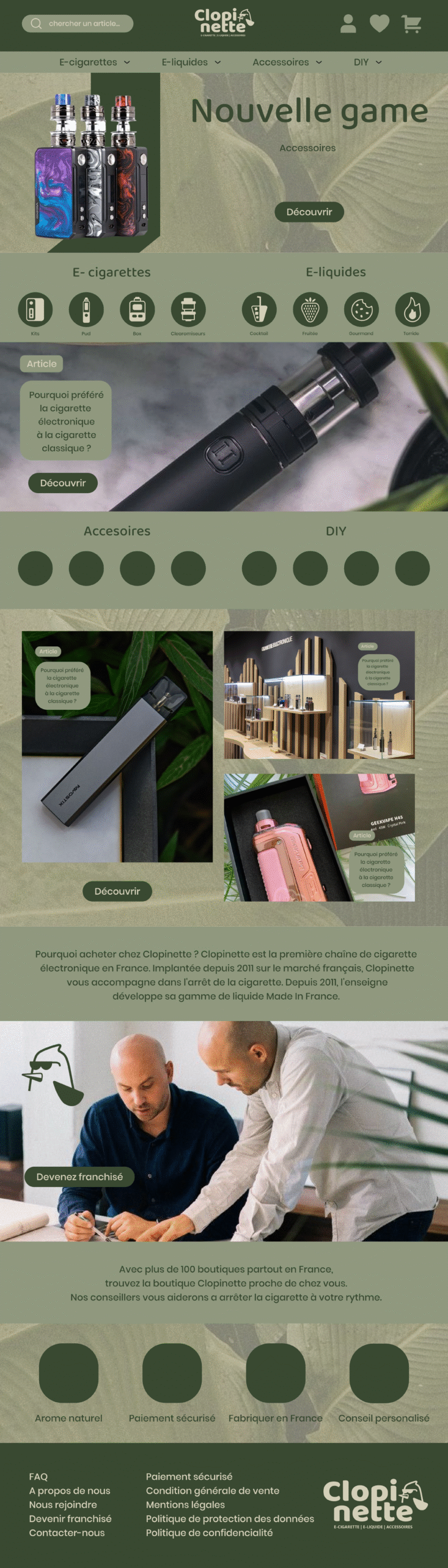 Dans le cadre de la refonte de l’identité de Clopinette, j’ai conçu une maquette web pensée pour incarner l’univers de la marque de façon moderne et structurée.Après une phase de wireframing, j’ai finalisé une maquette intégrant la nouvelle charte graphique, avec une hiérarchie claire et une navigation fluide.