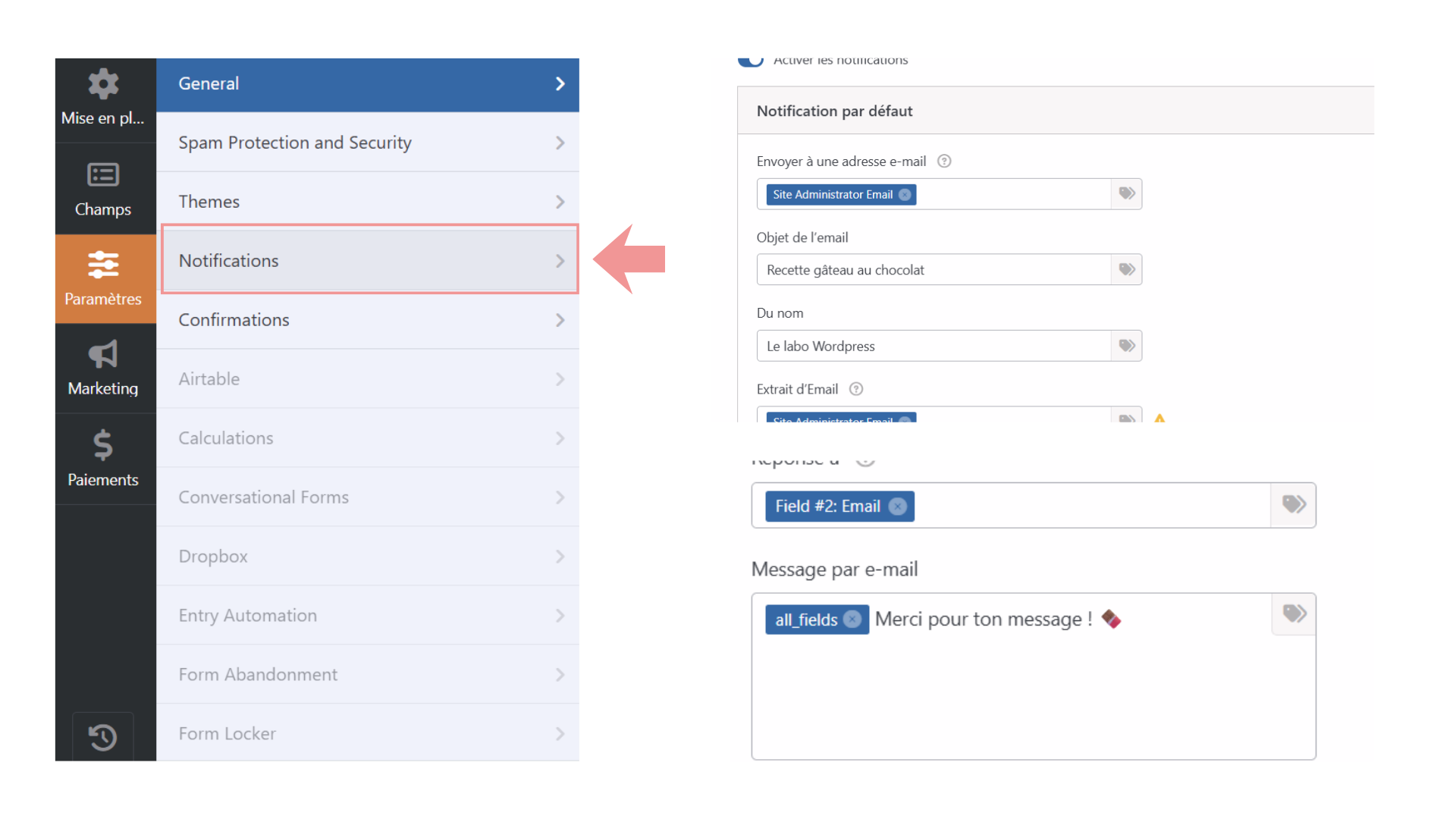 Etape 3 : Régler l’envoi du formulaire (pour recevoir les messages)